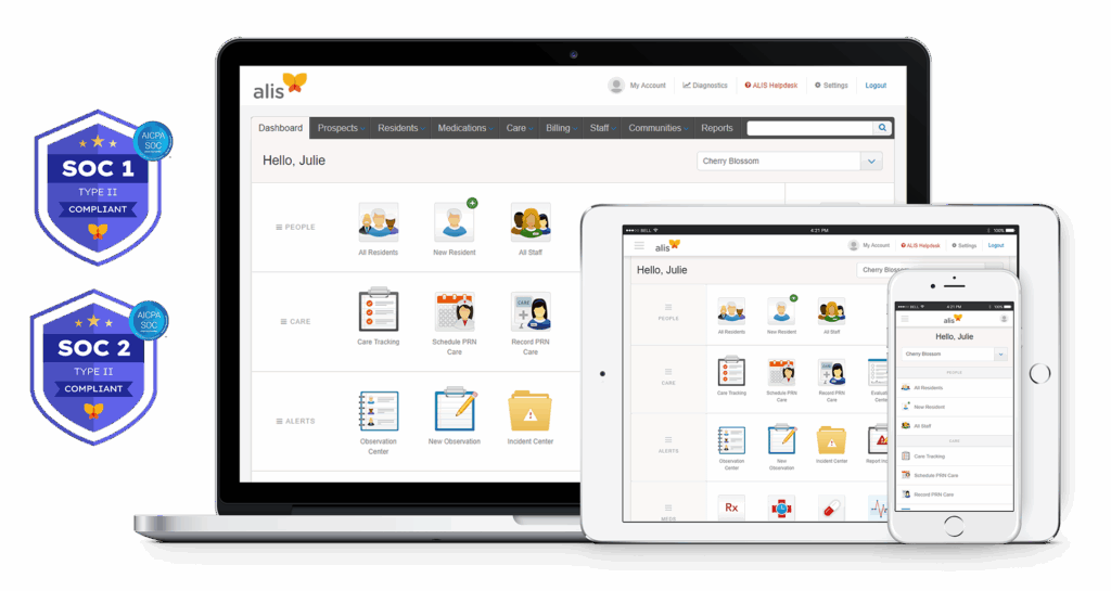 ALIS (pronounced “Alice”) stands for Assisted Living’s Intelligent Software. With a comprehensive suite of eHR tools, ALIS software solves the important challenges assisted living communities face using fast, secure technology. Growing portfolios prefer ALIS because they are able to manage compliance across state lines, take advantage of full eMAR management and drug counting, integrated assessments, family engagement, and more.